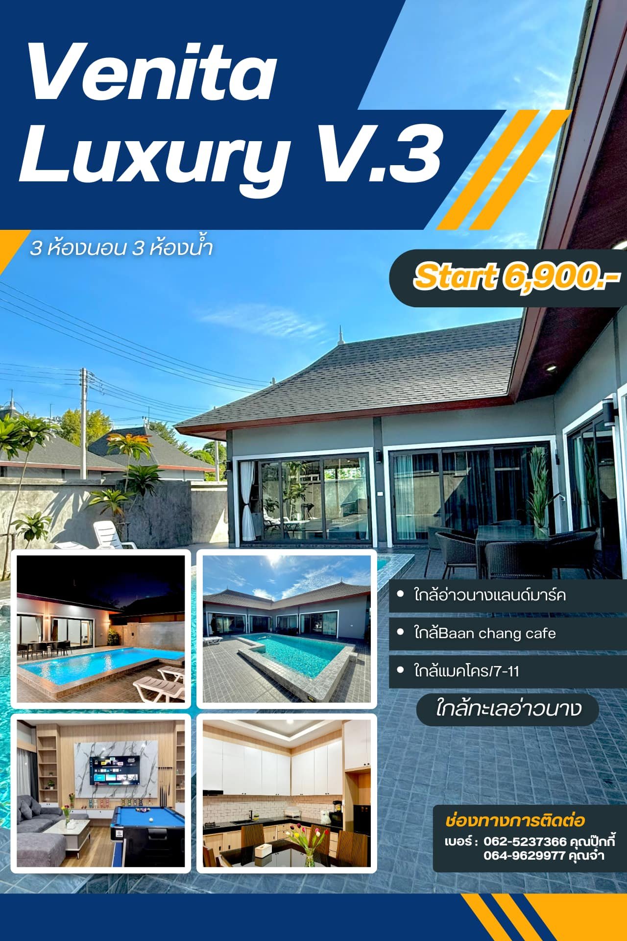 Venita Luxury Poolvilla V.3 offers 3 bedrooms, 3 bathrooms, 1 kitchen, 1 living room, and 2 parking spaces. It can accommodate 68 guests, with extra beds available for up to 5 additional guests. Children under 7 years old stay free (up to 3 children). Highlights include a spacious swimming pool with a 4-jet jacuzzi spa for ultimate relaxation, fancy floaties for stylish photo ops, and a pool table for fun-filled activities throughout your stay perfect for families or groups looking for a luxurious, private retreat.