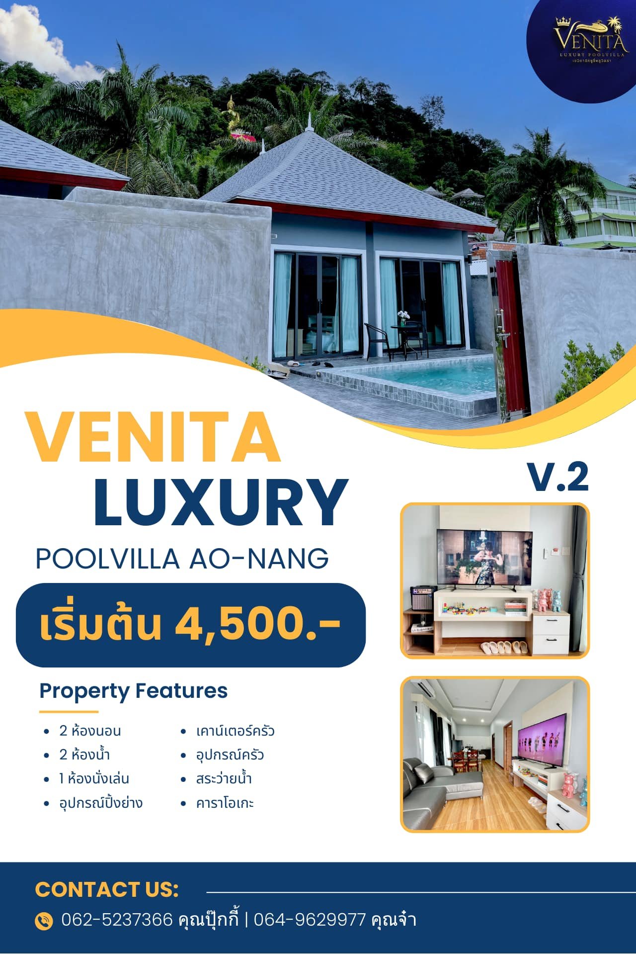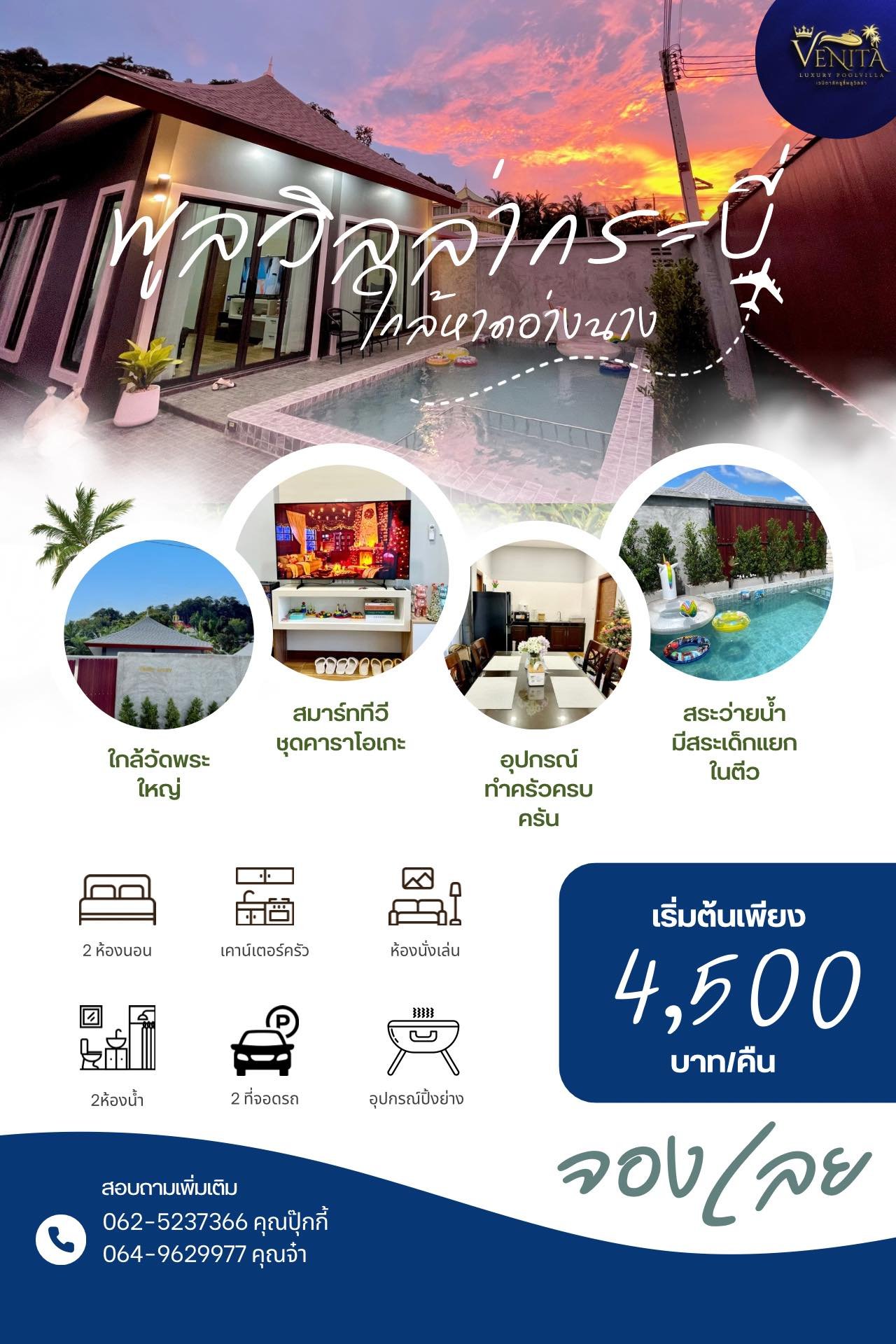 Venita Luxury Poolvilla V.2 มี 2 ห้องนอน 2 ห้องน้ำ พร้อมห้องรับแขกที่เชื่อมต่อกับเคาน์เตอร์ครัว และมีที่จอดรถรองรับได้ 2 คัน สามารถเข้าพักได้ 4-5 ท่าน โดยสามารถเพิ่มเตียงเสริมได้อีก 2 ที่นอน เด็กอายุต่ำกว่า 7 ปี เข้าพักฟรีได้สูงสุด 3 ท่าน มาพร้อมสระว่ายน้ำขนาดใหญ่สุดจุใจ ที่มีสระเด็กแยกในตัวเพื่อความปลอดภัยและความสนุกของเด็กๆ เหมาะสำหรับการพักผ่อนในบรรยากาศส่วนตัวทั้งครอบครัวหรือกลุ่มเพื่อนค่ะ